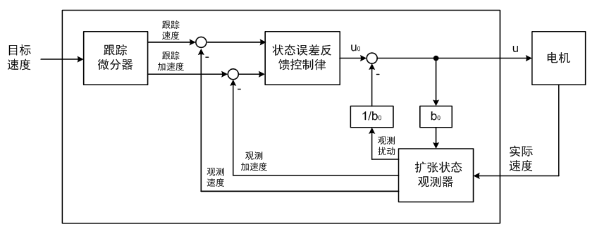 之前的微信我们介绍过,ADRC的“扩张状态观测器”输出的观测扰动,包含系统外部的干扰,如强风吹动螺旋桨,影响无人机的电机速度,也包含内部的干扰,例如电机发热,预先估计的特性不准了。对于图3的速度控制,如果实际速度比目标速度高,那么观测扰动是正数,它除以b0后再减去u0,输出量u将减少,电机的实际速度会下降;如果实际速度比目标速度低,那么观测扰动是负数,输出量u将增大,电机的实际速度会上升。这个补偿过程是最直接最快的,不像PID需要一系列计算才调整到输出量,控制就慢了。