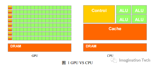由于GPU有高并行结构(highly parallel structure),所以GPU在处理图形数据和复杂算法方面拥有比CPU更高的效率。图 1 GPU VS CPU 展示了 GPU 和 CPU 在结构上的差异,CPU 大部分面积为控制器和寄存器,与之相比,GPU拥有更多的 ALU(Arithmetic Logic Unit,逻辑运算单元)用于数据处理,而非数据高速缓存和流控制,这样的结构适合对密集型数据进行并行处理。CPU 执行计算任务时,一个时刻只处理一个数据,不存在真正意义上的并行,而 GPU 具有多个处理器核,在一个时刻可以并行处理多个数据。