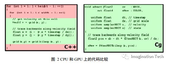 GPU 采用流式并行计算模式,可对每个数据进行独立的并行计算,所谓“对 数据进行独立计算”,即,流内任意元素的计算不依赖于其它同类型数据,例如,计算一个顶点的世界位置坐标,不依赖于其他顶点的位置。而所谓“并行计算” 是指“多个数据可以同时被使用,多个数据并行运算的时间和 1 个数据单独执行的时间是一样的”。图 2 中代码目的是提取 2D 图像上每个像素点的颜色值,在 CPU 上运算的 C++代码通过循环语句依次遍历像素;而在 GPU 上,则只需要一条语句就足够。