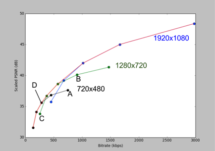 在每种分辨率下,编码质量随比特率增加而单调递增,但当比特率超过某一阈值后,曲线开始趋于平坦(A和B),其原因是每个分辨率都对应一个感知质量的上限。 当视频被降采样到低分辨率进行编码,而后超采样到全分辨率进行播放时,其高频成分将会丢失。
