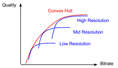 我们可以发现,每个分辨率都对应一段优于其他分辨率的比特率区域。如果我们汇集所有可用分辨率所对应的这些区域,它们会共同形成一个称为凸包的边界。从经济意义的角度来看,凸包是编码点达到帕累托(最优)效率的区域。理想情况下,我们希望能够精确地在凸包上进行操作,但由于实际条件的限制(例如能够选择的分辨率有限),我们将会选择与凸包尽可能接近的比特率 - 分辨率对。