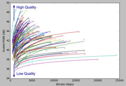 Netflix视频集中的众多主题(的视频)具有很高的信号特征多样性。下图中我们展示了100个随机抽样的主题的多样性。我们使用x264编码器在恒定量化参数(QP)比率控制的条件下,以1080p分辨率编码了100个源。在每一个量化参数下,我们将计算出的每类主题对应的比特率(以kbps为单位)作为x轴数值,以衡量视频质量的PSNR(峰值信噪比,以dB为单位)作为y轴数值,从而得到这些数据点。