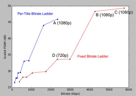 如上图所示,以不同比特率编码分辨率为1920×1080的视频片段,比特率为2350kbps时(A,按主题比特率阶梯)视频质量较高(PSNR约为45dB),当比特率增加到4300kbps(B,固定比特率阶梯)甚至5800kbps(C,固定比特率阶梯)时,视频的视觉质量并不会有明显的提升(PSNR大于等于45dB时,人眼不能感受到明显失真)。 利用固定比特率阶梯,在2350kbps比特率(D)下我们只能编码分辨率为1280×720的视频片段。 因此,那些可用带宽约为2350kbps的用户就只能观看720p的视频,而不是质量更好的1080p的视频了。
