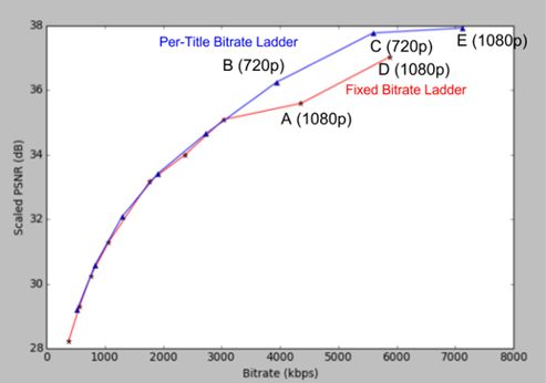对于大多数内容来说,这种“一刀切”的方式在给定比特率限制的情况下确实实现了高质量的编码。然而,在一些特殊情况下,例如摄像机噪点或胶片颗粒噪点较多的场景,以最高比特率5800kbps传输的视频流仍会在噪点多的区域出现块失真。而对于动画片这类简单内容,以5800kbps传输1080p的视频流又是非常浪费的。此外,网络带宽限制为1750kbps的用户也许能够在高清分辨率下观看动画片,而不该受限于比特率阶梯所指定的标清分辨率。