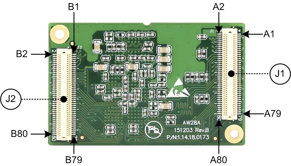 如图4.6所示为核心板产品管脚排列示意图,核心板采用了J1(A1 ~ A80)和J2(B2 ~ B80)两个精密的板对板连接器将处理器的资源从背面引出。J1和J2两个连接器对应引脚的出厂默认功能分别详见详见表4.2和表4.3。