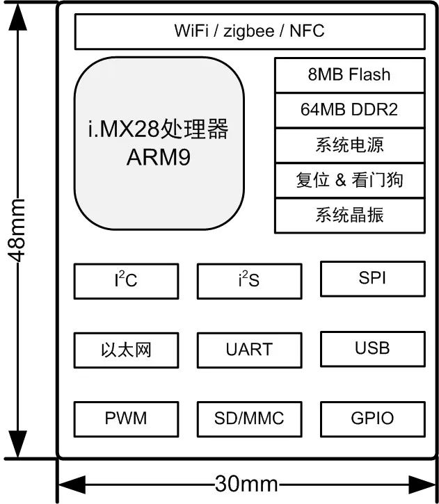 A280系列无线核心板将i.MX28处理器、DDR2、SPI Flash、硬件看门狗、Wi-Fi、zigbee、NFC等集成到一个30mm×48mm模组中,使其具备了无与伦比的性价比,A280系列无线核心板功能框图详见图4.5。