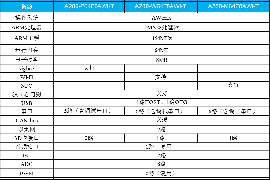 A280系列无线核心板(A280-Z64F8AWI-T、A280-W64F8AWI-T、A280-M64F8AWI-T三款核心板的简称)是ZLG致远电子精心设计的低功耗、高性能的嵌入式SoC无线核心板,处理器采用NXP基于ARM9内核的i.MX28处理器,主频最高454MHz,集成了DDR2、SPI Flash、硬件看门狗,支持多种通讯方式,比如,Wi-Fi、zigbee、NFC、UART、I²C、I²S、Ethernet、USB、SSP等,同时内部集成了电源管理单元PMU,大大地简化了系统电源设计,降低了产品设计成本。