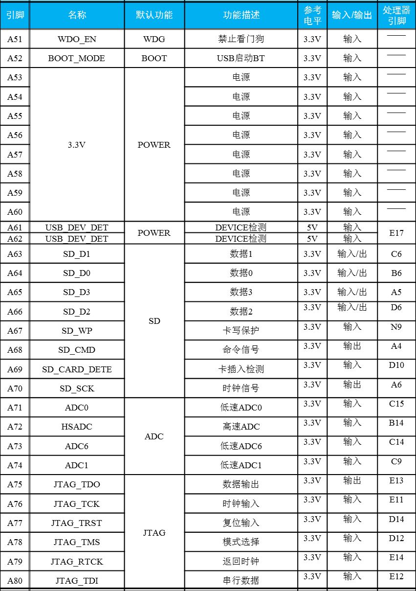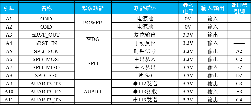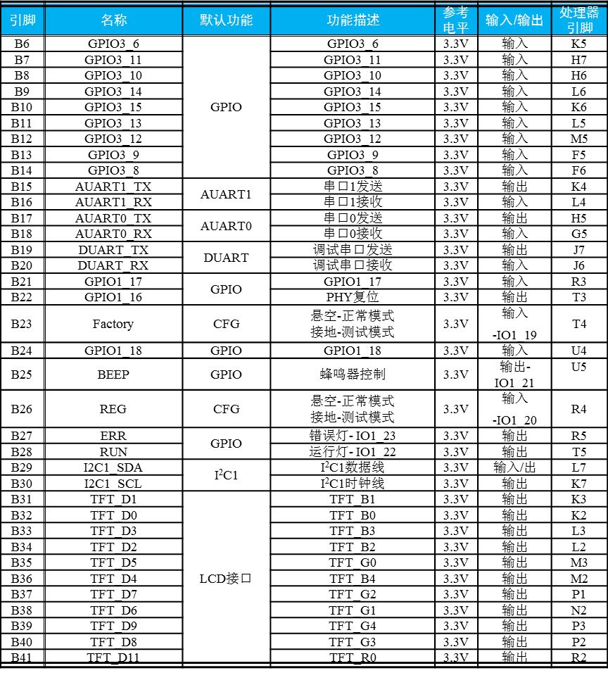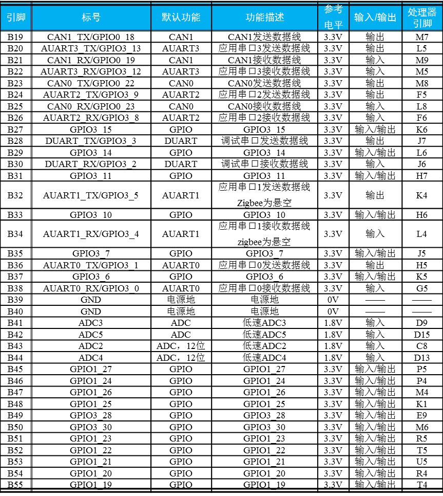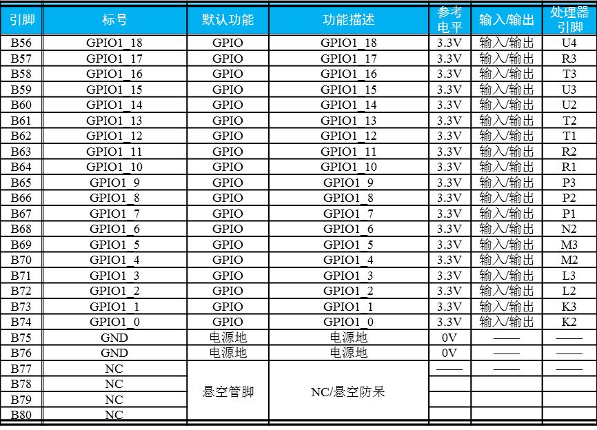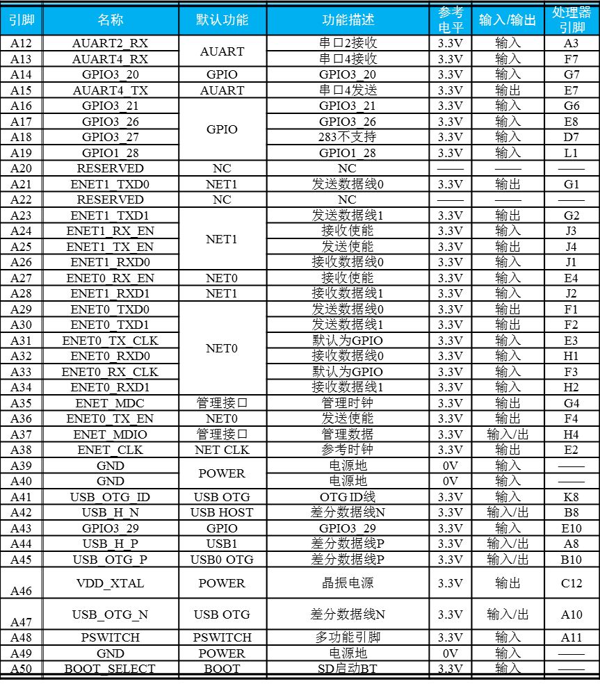 如图4.11所示为核心板产品管脚排列示意图,核心板采用了A(A1 ~ A80)和B(B2 ~ B80)两个精密的板对板连接器将处理器的资源从背面引出。A和B两个连接器对应引脚的出厂默认功能分别详见详见表4.5和表4.6。