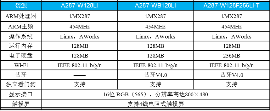 A287系列无线核心板的具体参数详见表4.4,用户可以根据自己的项目技术需求选择合适的核心板做二次开发。