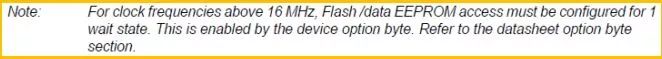 客户所遇到的问题应该就出在 24MHz 的使用上了。客户以前使用都是 16MHz 的主频。STM8 要求,如果用户使用的主时钟频率超过了 16MHz,那么 Flash 以及 EEPROM 的访问需要配置 1 个等待周期。
