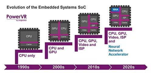 这对硬体来说是一个自然演进过程。从早期的桌面PC游戏到街机游戏机,到后来的家庭游戏机以及移动设备端等,PowerVR一直都与图形技术密切相关,除此之外,PowerVR还拥有包括电脑视觉和AI应用的系列IP产品。原本早期的桌面处理器甚至没有整合数学运算辅助处理器模组,无法在游戏类应用软体中提供浮点数运算加速功能,然后自20世纪80年代这种功能已经成为CPU设计的标准。在20世纪90年代以后,CPU整合了记忆体快取以进一步提升性能,不久GPU也被整合于其中。随后在2010年代出现了专用于编解码的ISP(图像讯号处理)和硬体设备,以实现流畅的视讯重播。现在轮到神经网络拥有专用的晶片了(图1)。