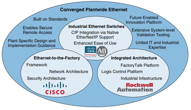 EtherNet/IP可以依据思科与罗克韦尔自动化有限公司的融合型全厂以太网(CPwE)架构实施,后者是一种面向工业网络设计的参考架构。其目标是通过面向设备的标准网络服务,把工业自动化和控制系统应用与范围更广的企业网络整合起来。EtherNet/IP为这一目标创造了条件。