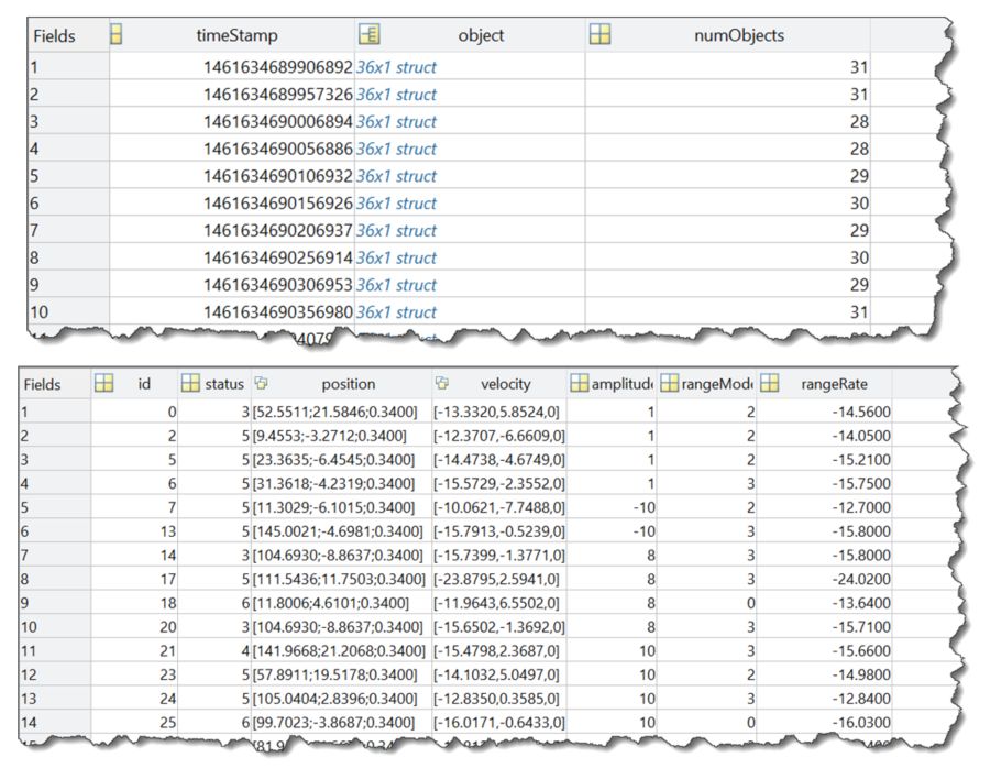 大家先一起看看汽车雷达和摄像头的数据长什么样。以雷达为例:下面两个数据表格显示了在什么时间戳,有多少个识别物体,物体的方位、速度等数据信息。