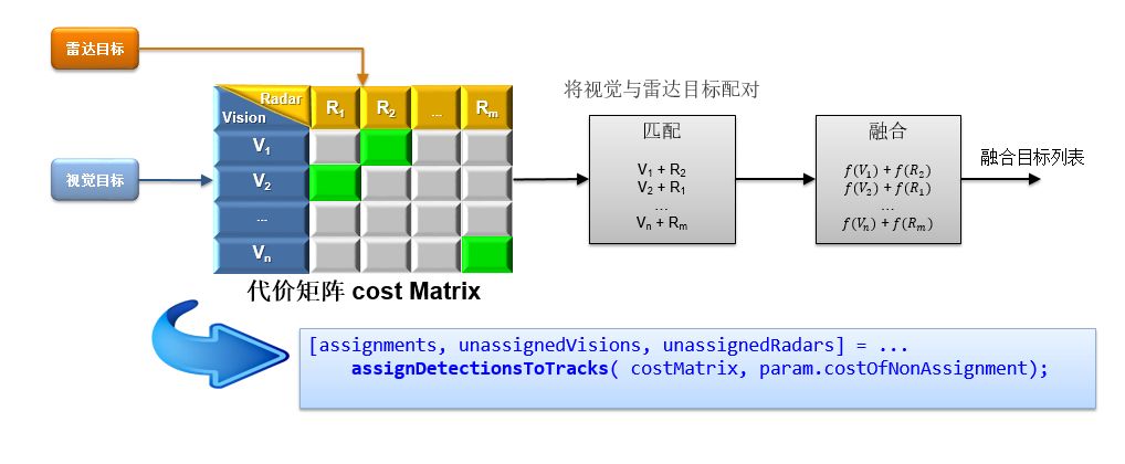 MATLAB 自带的多目标追踪,可以追踪最多 120 个运动中的目标。每个目标的最终的 track 可能既不是雷达的位置,也不是视觉的位置,而是最终 track 算出来的位置。下图展示了代价矩阵的示意图,将 detection 分配到 track 的过程用到了 Hungarian Assignment Algorithm。