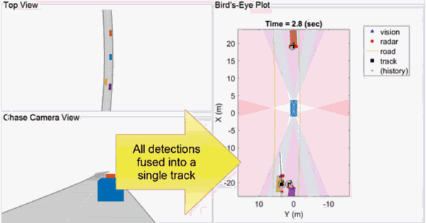 通过 MATLAB 自带的 API 和函数,用户可以比较容易地将雷达和摄像头的传感器数据,进行人眼可视化。上图左边是原始的摄像头画面,右边蓝色的三角代表摄像头识别的目标,红颜色代表雷达识别的目标。通过可视化,人眼可以看到雷达和摄像头的信号有一定的偏差,那么自然就会问另外一个问题,车载电子设备到底以哪个为准呢?这就自然引入 ADST 的另外一个功能 – Sensor Fusion(传感器融合)。