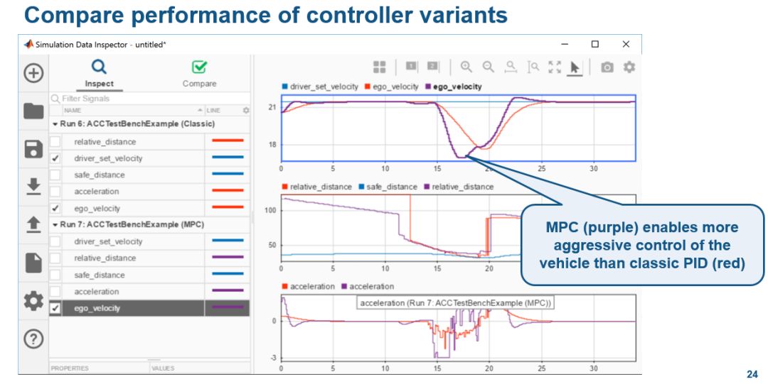 这里用到的速度控制是经典的 PID 控制。众所周知,PID 的好处是简单、易懂、占用资源少,但是在自动驾驶的复杂环境下,想要对车辆进行精准控制,可以考虑更加复杂的先进控制方法,比如 MPC(ModelPredictive Control)。从另外一个角度来看,MPC 过去没有流行的原因之一就是受限于硬件资源和成本。目前,在自动驾驶技术和需求的推动下,汽车控制器必须变得越来越强大,使得 MPC 变得可能。下图给出了在 ACC 的环境下,使用 PID 和 MPC 的对比:MPC 比 PID 控制的更加精准、快速。