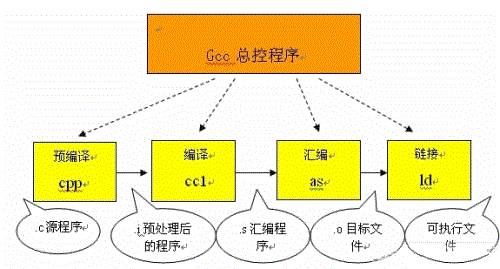 我们在Linux使用的gcc编译器便是把以上的几个过程进行捆绑,使用户只使用一次命令就把编译工作完成,这的确方便了编译工作,但对于初学者了解编译过程就很不利了,下图便是gcc代理的编译过程: