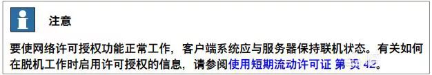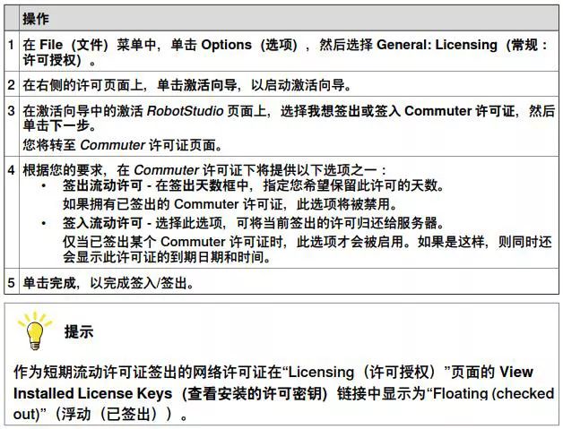 Commuter 许可证允许客户端系统与许可证服务器离线工作。用户可以在指定的天数中从服务器签出许可证。在此期间,其他用户无法使用签出的许可证。仅当用手动方式将Commuter 许可证签回到服务器后,其他客户端才能使用 Commuter 许可证。客户端系统中的短期流动许可证在超过签出时限后过期。这种情况下,当在客户端系统中启动 RobotStudio 时,将自动打开“Network License(网络许可证)”对话框, 提示用户将许可证重新签入服务器。