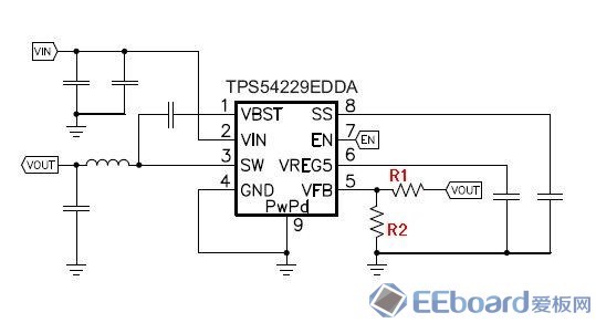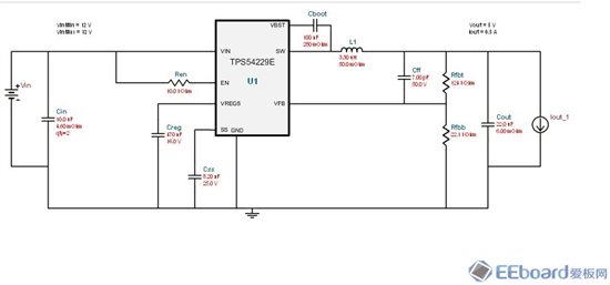 图片中红色圈起来的就是TPS54229E,该评估模块带有两个接线端子,一个跳线开关,用于使能芯片功能。此评估模块的电路原理图如下: