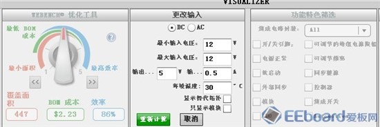在上面的设置参数里面进行设置,选择【DC】,最小输入电压=最大输入电压=12V,输出电压:3.3V,输出电流:0.5A,工作温度:30℃。如下图: