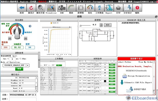 下面是系统生成的原理图、效率图、工作数值和BOM表的截图: