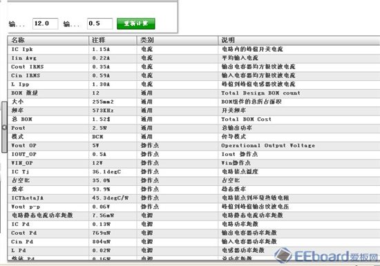通过效率图可以看出,方案整体效率在输出电流=0.05A时,已经能达到90%以上,当输出最大0.5A时,效率最高可达93.909%。下面的截图是工作数值和BOM表清单: