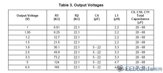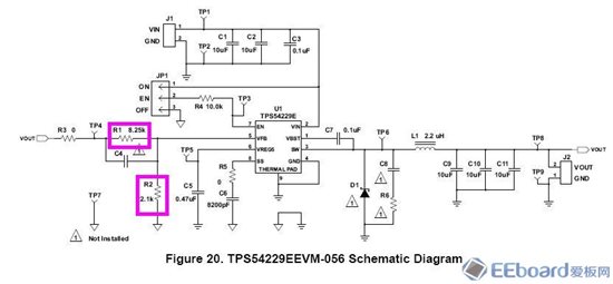 为了实现5V的电源输出,需要计算一下R1和R2的阻值,并对板子上的电阻进行替换。在TPS54229EEVM的说明书中,写明:“For higher output voltages of1.8 V or above, a feedforward capacitor (C4) may be required to improve phasemargin.”,意思是,要想输出1.8V以上的电压,必须把原理图中R1下面的C4焊上才行,默认是不焊接的。这个是说明书中自带的输出电压的阻容配置方案表:如下图:
