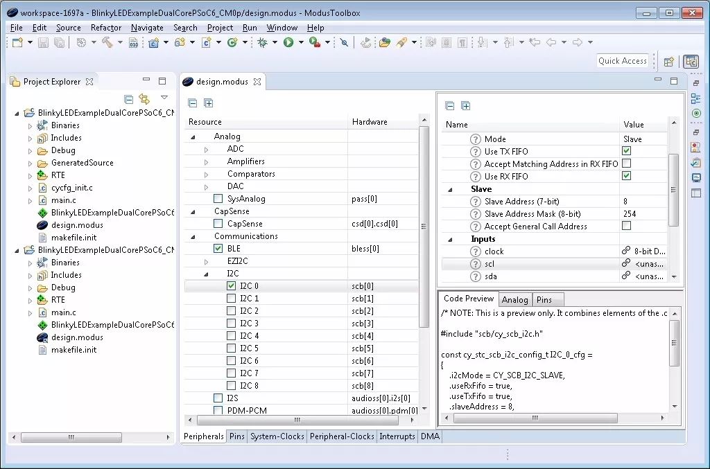 ModusToolbox支持专为物联网开发的赛普拉斯PSoC 6 MCU。PSoC 6将超低功耗40纳米工艺、低功耗设计技术、双核ARM®Cortex®-M4和Cortex-M0 +架构以及可配置的模拟和数字资源,以及硬件安全技术集于一身,成为业内功耗最低、最灵活的MCU。赛普拉斯外设驱动程序库(PDL)为开发人员提供了一种简单、统一的设计方法,从而最大限度地利用超低功耗双核PSoC 6架构延长电池续航时间并提供高效的处理能力。该库包含基于赛普拉斯业内领先的CapSense®电容传感技术的接近和触摸感应解决方案,易于使用。ModusToolbox还使开发人员能够利用PSoC 6 MCU的硬件安全功能,如隔离执行环境、集成安全元件功能和加密加速器等保护应用中的敏感数据。