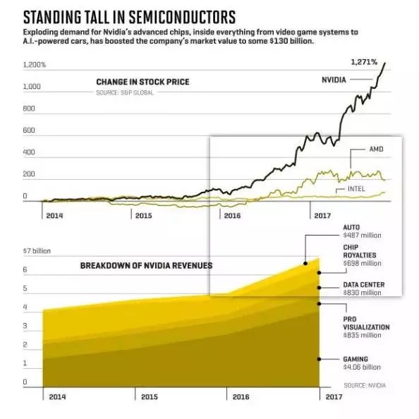 1999年于纳斯达克成功上市,为Nvidia开启了一连串的里程碑。那一年,它发布了被称为世界上第一个GPU的GeForce 256。2006年,它推出了CUDA,一种并行计算架构,允许研究人员在数千个GPU上运行极其复杂的练习,将这些芯片从电子游戏的唯一领域中提取出来,并使其可用于各种类型的计算。 2014年,该公司通过重新定位称为Tegra的芯片用于汽车使用,重新启动了智能手机业务的出价竞标。随着时间的推移,这些举措被证明是有先见之明的,为Nvidia在国防,能源,金融,医疗,制造和安全等行业开启了新的收入来源。