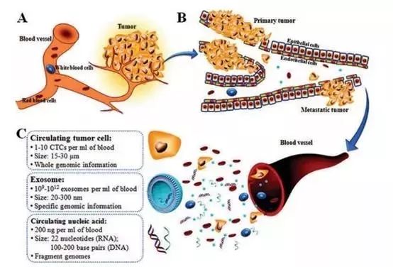 图1:癌症的形成(A)、转移(B)及循环肿瘤标志物的特点(C)