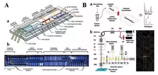 鉴于现在检测技术不成熟,限制了肿瘤标志物cNAs的临床应用。传统提取分析核酸的方法,如电泳结合荧光染色技术,有一定的局限性,劳动密集型和高成本,且分步操作容易导致样品损失。微流控系统集多种技术于一体,一个设备可顺序执行多个操作,如样品制备,反应,分离,纯化和分析,减少样本损失,提高样本纯度。