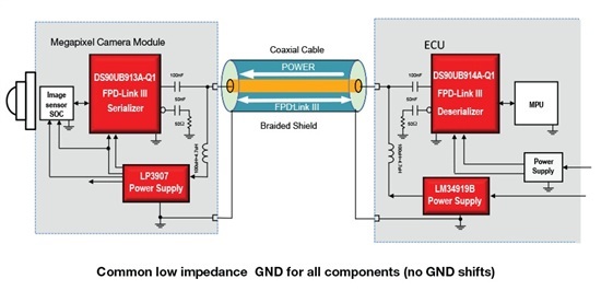 高速串行数字链路连接视频组件,可在摄像头的数字成像器与数字 LCD 显示屏之间实现无缝连接。汽车视频链路中部署的最常用及最可靠高速数字接口技术基于 ANSI/TIA/EIA-644-A 低电压差分信号 (LVDS) 标准。LVDS 可提供一个稳健的数据传输标准,支持远距离、低功耗、高噪声抑制性以及低 EMI。LVDS 采用差分方式(而非接地所参考的单端信号)实现所需的链路属性。