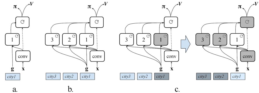 当智能体达到目的地时,它就会获得奖励(具体来说是一个经纬度坐标),就像一个没有地图的邮递员,要送无数的快递。随着时间的发展,智能体慢慢学会了用这种方法穿越整个城市。我们同样证明了智能体可以学习多个城市的道路,并且这种学习方法能有效迁移到新的城市中。