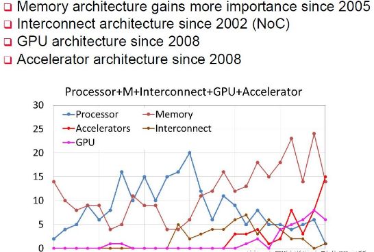 在计算机体系结构国际顶级会议 ISCA2016 上有个关于体系结构 2030 的小型研讨会,名人堂成员 UCSB 的谢源教授就对 1991 年以来在 ISCA 收录的论文进行了总结,专用加速部件相关的论文收录是在 2008 年开始,而在 2016 年达到了顶峰,超过了处理器、存储器以及互联结构等三大传统领域。而在这一年,来自中国科学院计算技术研究所的陈云霁、陈天石研究员课题组提交的《一种神经网络指令集》论文,更是 ISCA2016 最高得分论文。