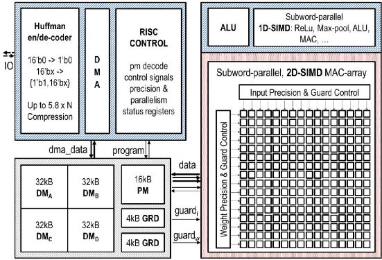 比利时鲁汶大学的Bert Moons 等在2017 年顶级会议 IEEE ISSCC 上面提出了能效比高达 10.0TOPs/W 的针对卷积神经网络加速的芯片ENVISION,该芯片采用 28nm FD-SOI 技术。该芯片包括一个 16 位的 RISC 处理器核,1D-SIMD 处理单元进行 ReLU 和 Pooling 操作,2D-SIMD MAC 阵列处理卷积层和全连接层的操作,还有 128KB 的片上存储器。