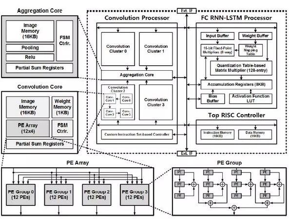 韩国科学技术院KAIST 的Dongjoo Shin 等人在 ISSCC2017 上提出了一个针对 CNN 和 RNN 结构可配置的加速器单元 DNPU,除了包含一个RISC 核之外,还包括了一个针对卷积层操作的计算阵列 CP 和一个针对全连接层 RNN-LSTM 操作的计算阵列 FRP,相比于鲁汶大学的 Envision,DNPU 支持 CNN 和 RNN 结构,能效比高达 8.1TOPS/W。该芯片采用了 65nm CMOS 工艺。