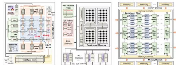 该论文针对深度神经网络的训练部分进行针对性优化,提出了一个可扩展服务器架构,且深入分析了深度神经网络中卷积层,采样层,全连接层等在计算密集度和访存密集度方面的不同,设计了两种处理器core 架构,计算密集型的任务放在了 comHeavy 核中,包含大量的 2D 乘法器和累加器部件,而对于访存密集型任务则放在了 memHeavy 核中,包含大量 SPM 存储器和 tracker 同步单元,既可以作为存储单元使用,又可以进行计算操作,包括 ReLU,tanh 等。而一个 SCALEDEEP Chip 则可以有不同配置下的两类处理器核组成,然后再组成计算簇。