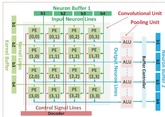 中国科学院计算机体系结构国家重点实验室在顶级会议HPCA2017 上提出了一种基于数据流的神经网络处理器架构,以便适应特征图、神经元和突触等不同层级的并行计算,为了实现这一目标,该团队对单个处理单元 PE 进行重新设计,使得操作数可以直接通过横向或纵向的总线从片上存储器获取,而非传统 PE 只能从上至下或从左至右由相邻单元获取。该芯片采用了 TMSC 65nm 工艺,峰值性能为 490.7 GOPs/W。