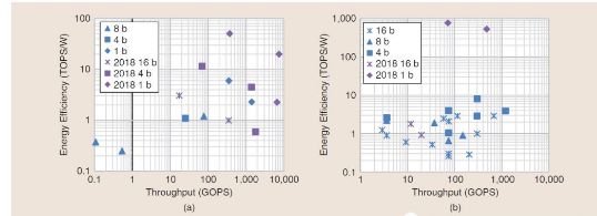 同时,为了获得更高的能效比,越来越多的研究者把精力放在了低精度神经网络的设计和实现,如 1bit 的神经网络。这些新型技术,使得深度学习加速器的能效比从去年的几十 TOPS/W 提升到了今年的上百 TOPS/W。有些研究者也对数字 + 模拟的混合信号处理实现方案进行了研究。对数据存取具有较高要求的全连接网络,有些研究者则借助 3-D 封装技术来获得更好的性能。