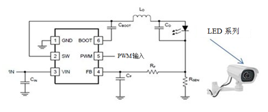 图1所示为TPS54200的简化电路原理图,驱动一系列外部元件数量绝对最少的白色LED灯。这对于商业/工业用途的视频监控摄像头或其他通用LED照明而言,将是一个很好的解决方案。