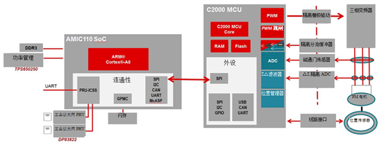 例如,一个电机控制应用程序可使用C2000™微控制器(MCU)来控制电机,如图1所示。为了添加像EtherCAT这样的协议,C2000 MCU可通过串行外设接口(SPI)与AMIC110进行通信,而AMIC110 SoC将处理至网络其余部分的协议基通信。