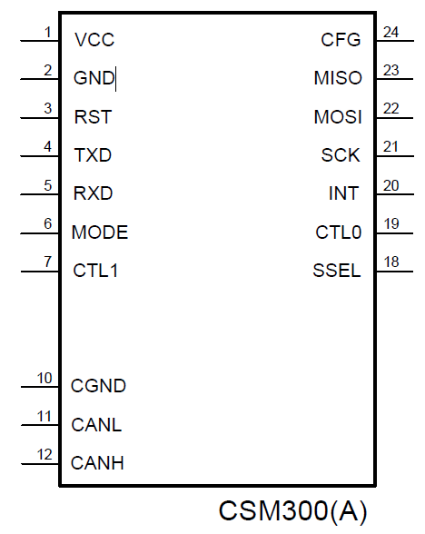 CSM300(A)具有3种接口。一种是SPI接口,一种是UART接口,另外一种是CAN接口。其引脚排列如图3所示: