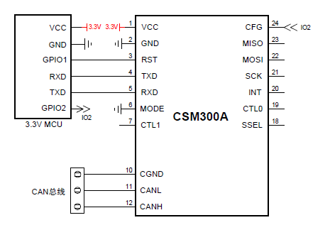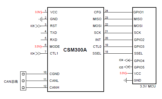 SPI转CAN模式,其硬件参考图如图4所示,在此工作模式下,CSM300(A)始终作为SPI从机,SPI限定工作在模式3(CPOL、CPHA均为1),数据长度限定为8位,MSB高位先传输。透明转换、透明带标识转换下最高通信速率为1.5Mbps,自定义协议转换最高通信速率为1Mbps。SPI主机可以发送数据至CAN总线端,且可接收CAN总线端收到的数据。此时UART接口无效,不会处理任何出现在UART接口的数据,也不会返回CAN总线端接收到的数据至UART。