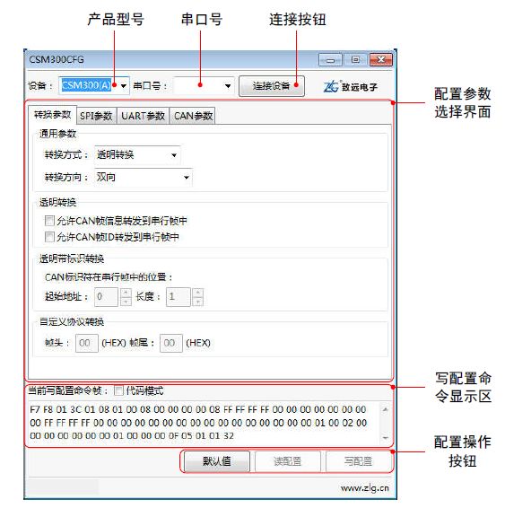 CSM300模块带有配置工具CSM300CFG,用户可以使用此软件非常方便地对产品进行配置,同时软件提供用户当前选择配置的写配置命令帧的完整帧数据,用户可以直接复制到程序中使用,免除用户设定命令帧的繁琐工作。