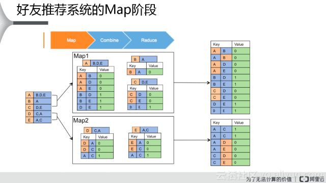 首先输入左侧机器可以识别的数据,输入之后,在Map端先把数据做一个拆分,拆分成两份不同的数据,在拆分的同时把它转换成key、value的类型,比方说A、B、D、E这几行数据转换成什么呢?A跟B,然后value是零,零代表他们两个已经是好友。如果两个不是好友的话,自定义这一行数据,B跟D不是好友,就把他的值视为1。下面的B、E,还有D跟E也是1。把原来一行数据转换成Key、Value这个形式的数据,类似于右边这样的数据,上面是key、value的一个类型,下面也是类似的。这个是在Map做的事情,把这个数据通过两个key、value进行一个拆分,转化成key、value这样的一个类型。
