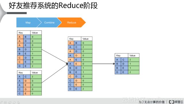 接着是第三步是Reduce阶段,Reduce是对这些数据进行一个汇总,把两边数据汇总到一起,然后对每一个Key值对应唯一的一个value值做一个汇总,这个就是它最终计算的一个结果。如果两个用户已经是好友了,Value值是零的话,不需要再给他推荐。所以说A、B如果是零的话就剔掉,只需要知道它的value值是大于零的,有潜在好友,同时这两个人目前还是非好友的关系,这个就达到了想要的效果。