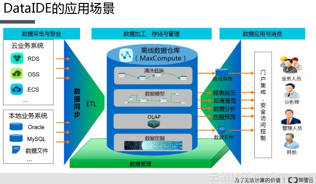 这个是DateIDE整个应用的一个场景,我们在进行数据分析的时候,需要对里面的原数据进行整合统一保存,这个时候可以在DateIDE上实现,把所有的原数据的信息统一汇总到MaxCompute里面进行一个保存,同时还可以DateIDE进行数据的加工,存储等操作都可以在DateIDE上完成。DateIDE在整个数据分析的过程中可以对数据存储、分析、处理、集群等处理。