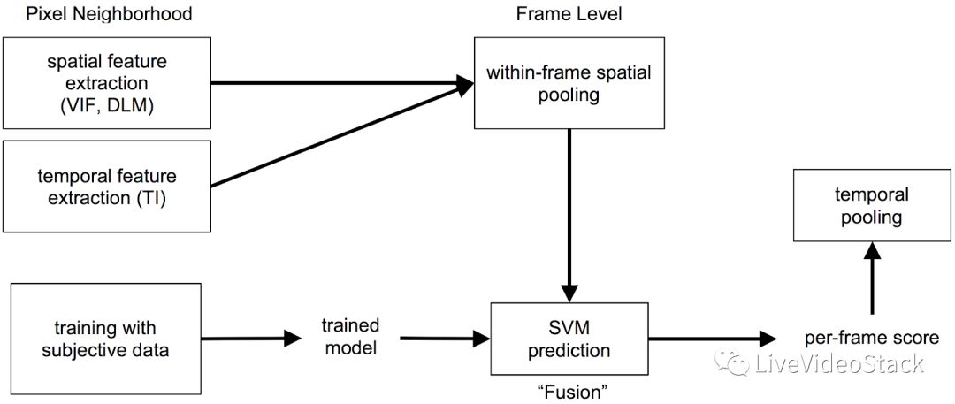 它依赖于现有的图像质量指标(VIF, DLM),且经过适当修改以覆盖多个分辨率,以及视频序列中连续视频帧之间的移动量,这些移动量作为输入到机器学习权重集中的特征。最后的得分是在支持向量机(SVM)回归器中结合这些基本特征所得的结果。