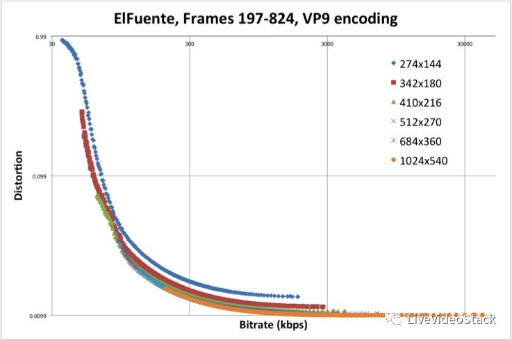 图6:使用VP9(libvpx)以各种编码分辨率和量化参数(QP)获得的来自“El Fuente”的特定shot的多个(R,D)点。