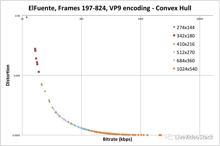 图7:使用VP9(libvpx)从“El Fuente”拍摄同一shot的(R,D)操作点的凸包